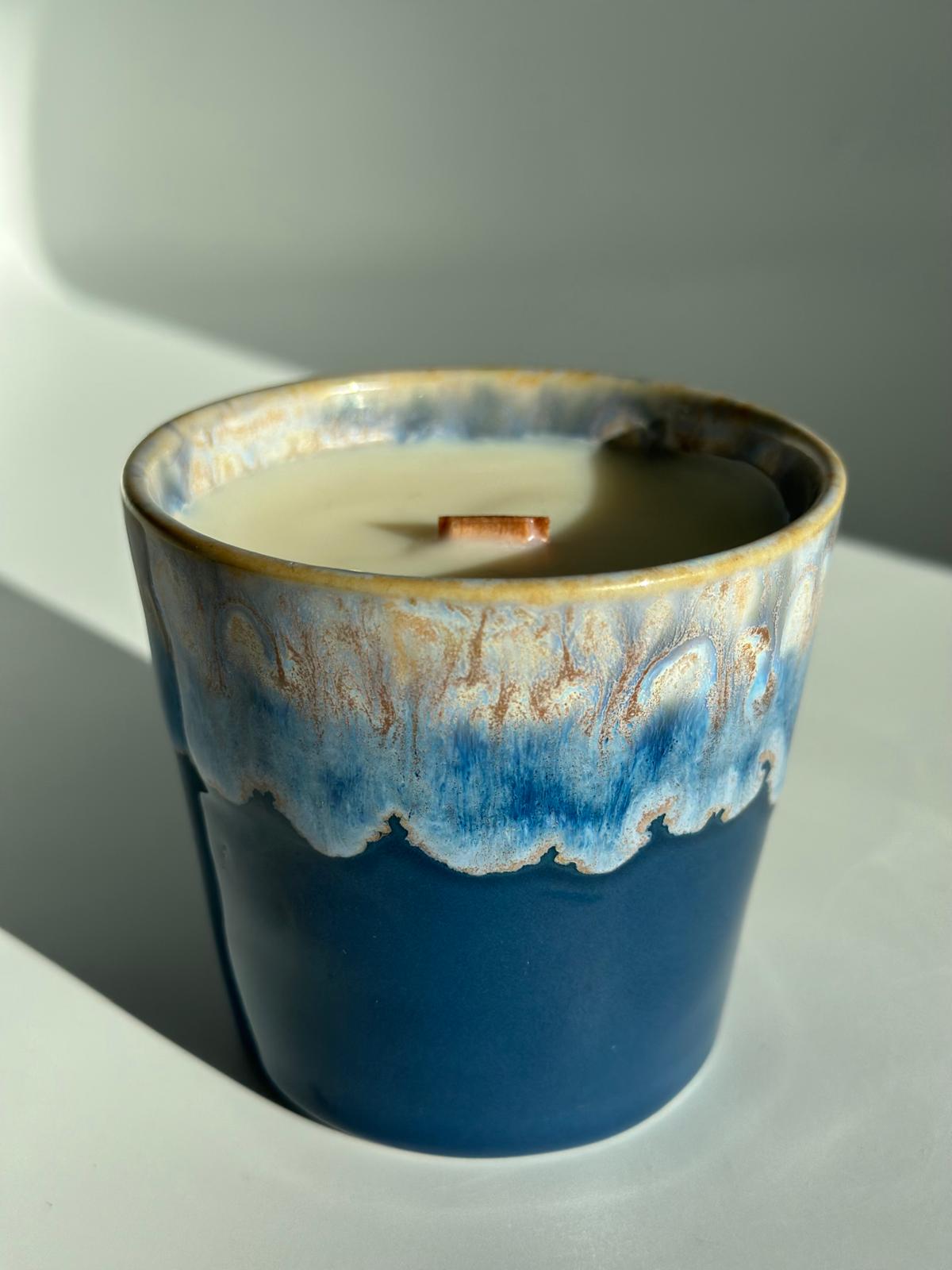 Poured into a beautifully glazed ceramic cup made from Portuguese stoneware, this candle contains approx. 175 g of natural soy wax and offers around 35 hours of burn time. After the candle is finished, simply wash the cup and reuse it as your new favorite coffee or tea mug.